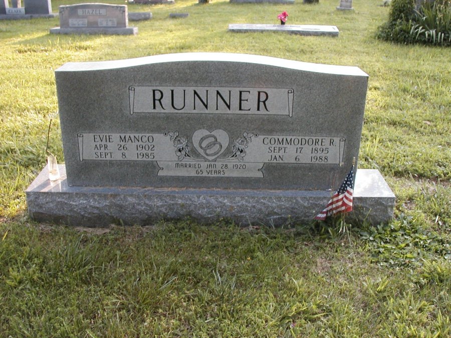 9710 Individuals in our Database | | | | Commodore R Runner Sex: Male | | | |  | Birth Date | 1895 SEP 17 Warren County KY | Death Date | 1988 JAN 06 Mt Zion Cemetary, Warren County KY | Father | Benjamin Thomas Runner Ben | Born: 1866 NOV Warren County KY | Died: 1911 MAR 31 | Mother | Maggie Daisey Shields | Born: 1875 DEC 27 | Died: 1903 FEB 24 | | |  | Birth Date | 1902 APR 26 Warren County KY | Death Date | 1985 SEP 08 Mt Zion Cemetary, Warren County KY | Father | Robert Manco | Born: 1868 Jul 15 | Died: 1927 Feb 13 | Mother | Lottie Jones | Born: 1875 Jul 20 | Died: 1958 Aug 23 | Evie May Manco Evie Notes: | | | |