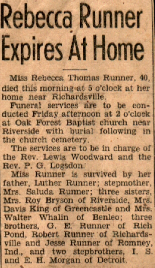 9710 Individuals in our Database | | | | Rebecca Thomas Runner Sex: Female | | | |  | Birth Date | 1902 FEB 27 Richardsville, Warren Co KY | Death Date | 1942 JUN 24 Warren County KY | Father | James Luther Runner | Born: 1870 MAR 25 Richardsville, Warren Co KY | Died: 1951 FEB 04 | Mother | Adelia Ann Shields | Born: 1871 OCT 17 | Died: 1907 AUG 05 | | | 0 | Children | Birth Death | Mother | Spouse | Grand Children |