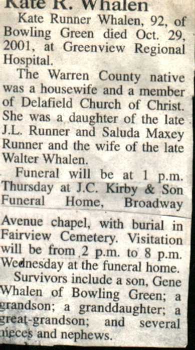 9726 Individuals in our Database | | | | | | Lucy Kate Runner Sex: Female | | | |  | | Birth Date | 1909 AUG 29 Bowling Green, Warren Co KY | | Death Date | 2001 OCT 29 Bowling Green, KY | | Father | James Luther Runner | Born: 1870 MAR 25 Richardsville, Warren Co KY | Died: 1951 FEB 04 | | Mother | Saluda Maxey | Born: 1870 JUN 24 | Died: 1945 JAN 01 | | |  | | |