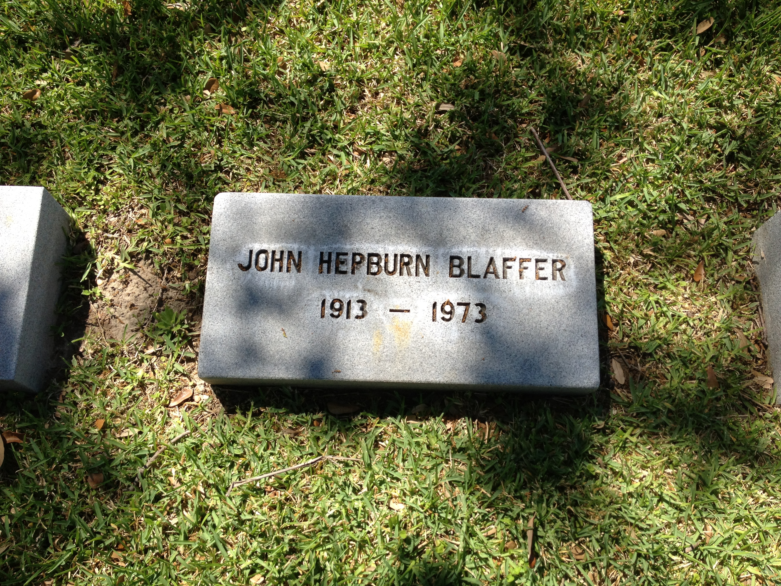 9726 Individuals in our Database | | | | | John Hepburn Blaffer Sex: Male | | | |  | | Birth Date | 1913 | | Death Date | 1973 | | Father | Robert E Lee Blaffer | Born: 1875 FEB New Orleans, Orleans, LA | Died: 1942 OCT 22 | | Mother | Sarah Campbell | Born: 1885 | Died: 1975 MAY 13 | | John Hepburn Blaffer Notes: | When John Hepburn Blaffer was born on 1 August 1913, in Harris, Texas, United States, his father, Robert Lee Blaffer, was 40 and his mother, Sarah Turnbow Campbell, was 26. He married Camilla Geraldine Davis on 22 June 1940, in Dallas, Dallas, Texas, United States. They were the parents of at least 1 son and 1 daughter. He immigrated to New York City, New York, United States in 1934. He died on 7 September 1973, in Houston, Harris, Texas, United States, at the age of 60, and was buried in Houston, Harris, Texas, United States.