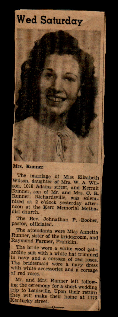 9710 Individuals in our Database | | | Elizabeth WIlson Sex: Female | | | | |  | Birth Date | | | | Father | Commodore R Runner | Born: 1895 SEP 17 | Died: 1988 JAN 06 | Mother | Evie May Manco | Born: 1902 APR 26 | Died: 1985 SEP 08 | | | 0 | Children | Birth Death | Mother | Spouse | Grand Children |